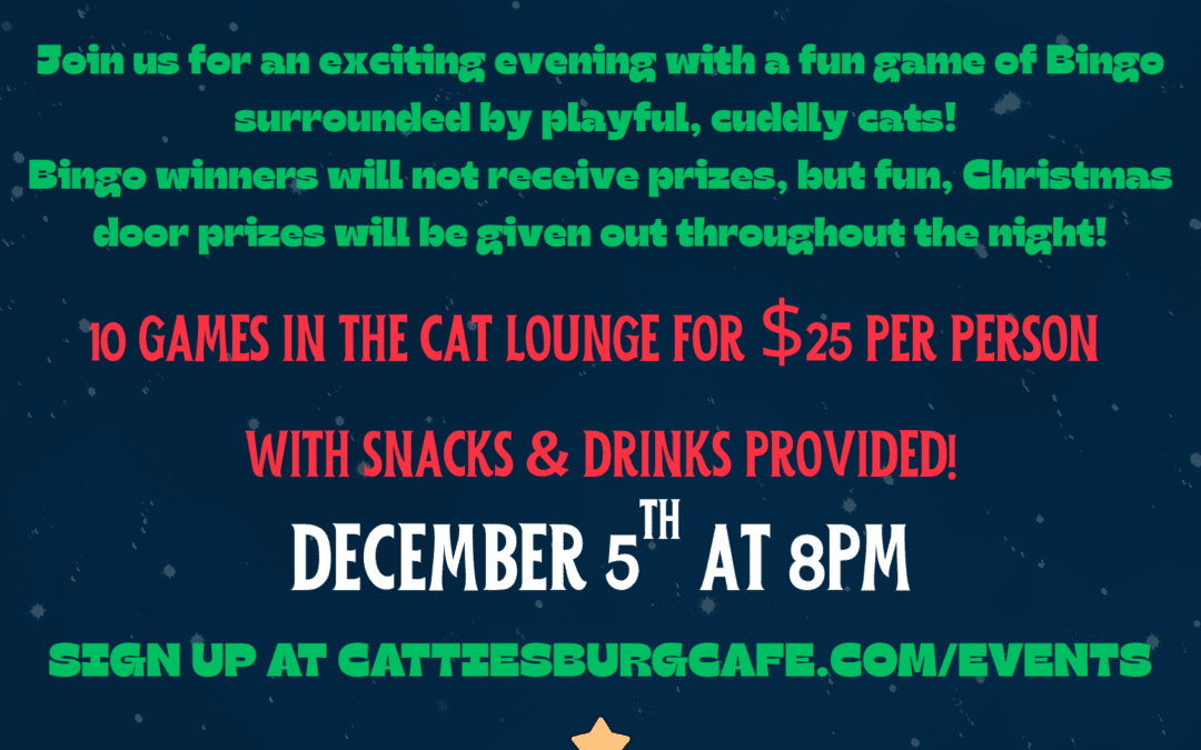 Calling all cat lovers! Join us for a meow-velous Bingo Night on December 5th! Enjoy 10 exciting games in the cozy cat lounge, surrounded by our playful, cuddly kitties. Your $25 ticket includes snacks, drinks, and chances to win pawsome door prizes! Don’t miss out on this purr-fect night of fun—sign up now at cattiesburgcafe.com/events!
