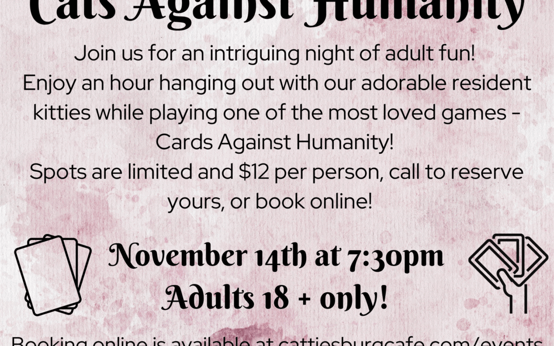 Ready to laugh ‘til you’re hiss-terical? Join us for Cats Against Humanity at Cattiesburg Cafe on November 14th at 7:30 PM! Enjoy a wickedly funny night of Pets Against Humanity surrounded by our sassiest feline friends. It’s the purr-fect mix of chaos and cats—just $12 per person (ages 18+ only). Snag your spot now at cattiesburgcafe.com/events. Let the inappropriate hilarity begin—don’t make us paws the game without you!