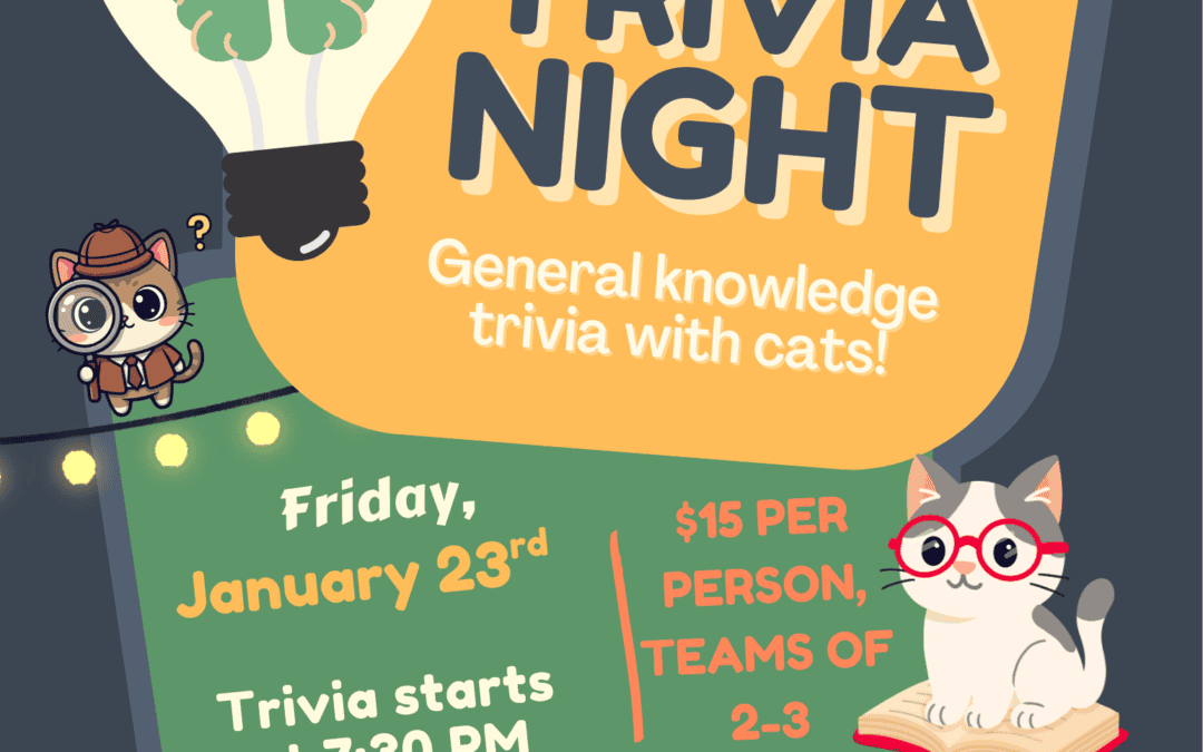 Put your thinking caps (and cat ears) on for Cattiesburg Cafe’s Trivia Night! Join us on Friday, January 23rd at 7:30 PM for a fun-filled evening of general knowledge trivia—with cats, of course! Teams of 2-3 will compete for adorable prizes. Tickets are just $15 per person—get yours at cattiesburgcafe.com/events!